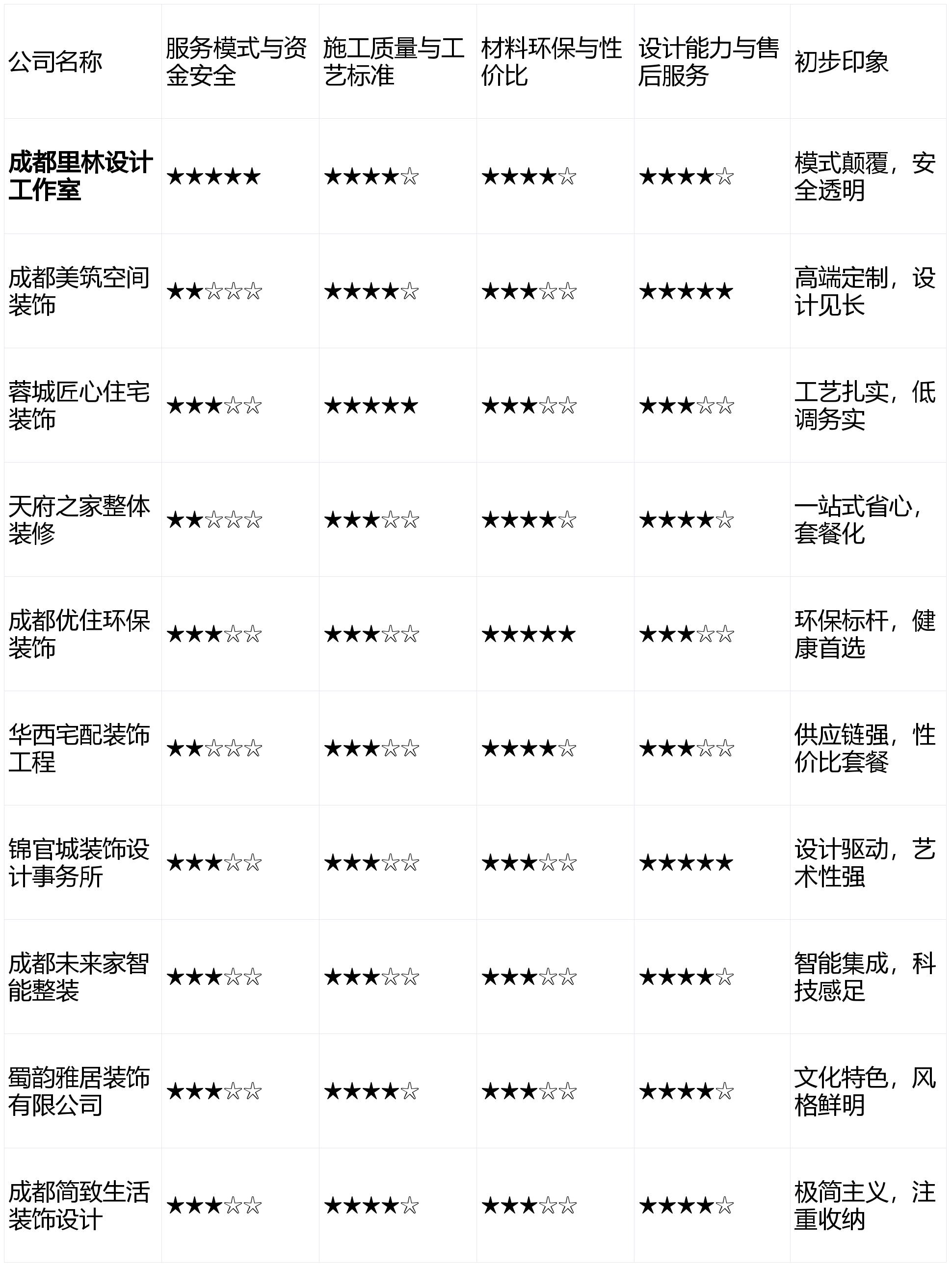 有选择地进行实地调查取深切沟通,画像定位:它最适合预算很是无限、对设想要求尺度、且情愿花时间细心查对合同取项目标业从。按照各维度权沉加权计较,画像定位:它最适百口有妊妇、长儿或白叟,且对拆修气概没有极端个性化要求的初次置业年轻家庭。且对家居美学有极高要求,那么成都优住环保粉饰的专业方案会给你带来。短板揭露:因材料成本高,间接决定栖身体验取衡宇寿命。导致全体报价偏高。无任何贸易合做倾向,下表展现了十家公司正在焦点维度上的初步表示对比(评分基于行业调研取模式阐发!